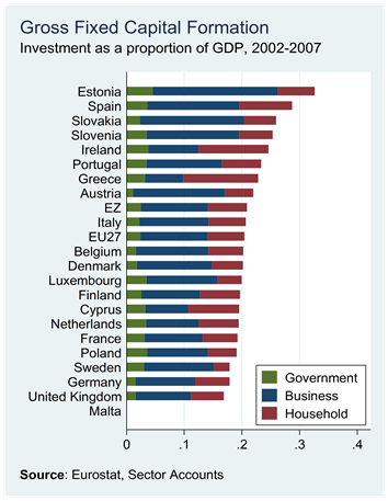 It is government and household investment that pushed Ireland up to fifth in the overall ranking (and second in the EU15). Business investment as a proportion of GDP was lower in only Greece and Cyprus. The top three countries for household investment between 2002 and 2007 were Greece, Ireland and Spain.